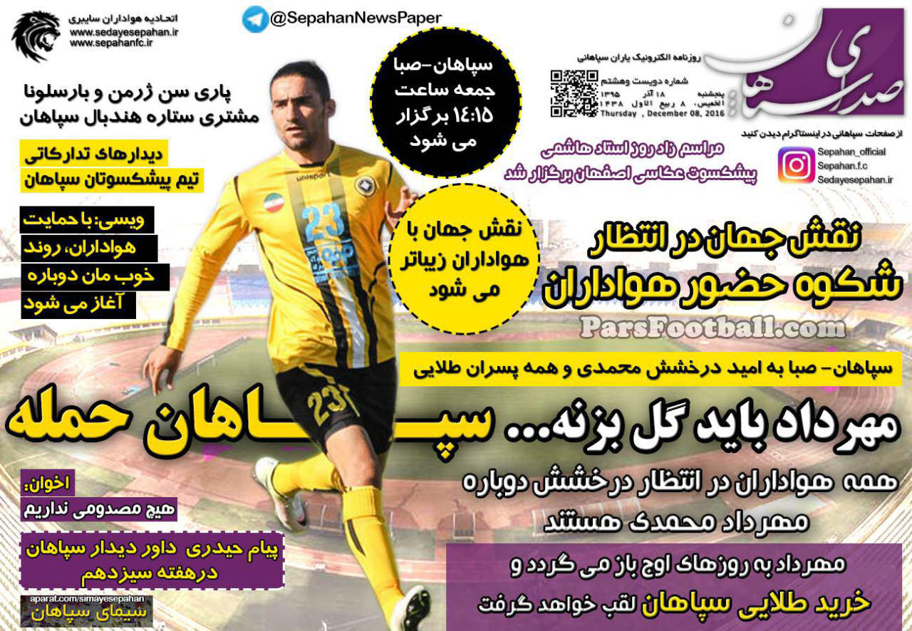 روزنامه صدای سپاهان ، پنجشنبه ۱۸ آذر | مهرداد باید گل بزنه ….. سپاهان حمله