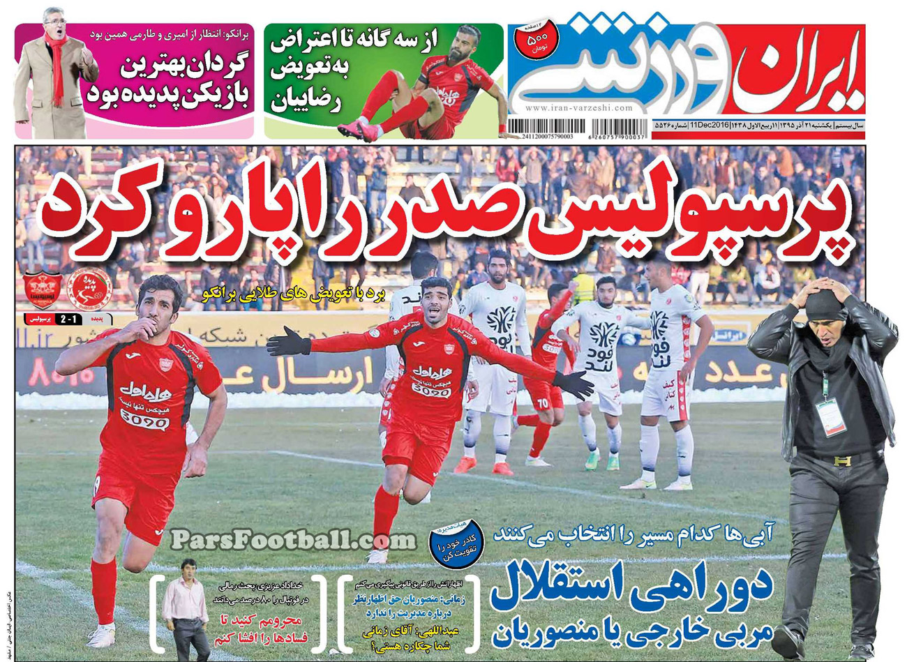 روزنامه ایران ورزشی ، یکشنبه ۲۱ آذر | پرسپولیس صدر را پارو کرد