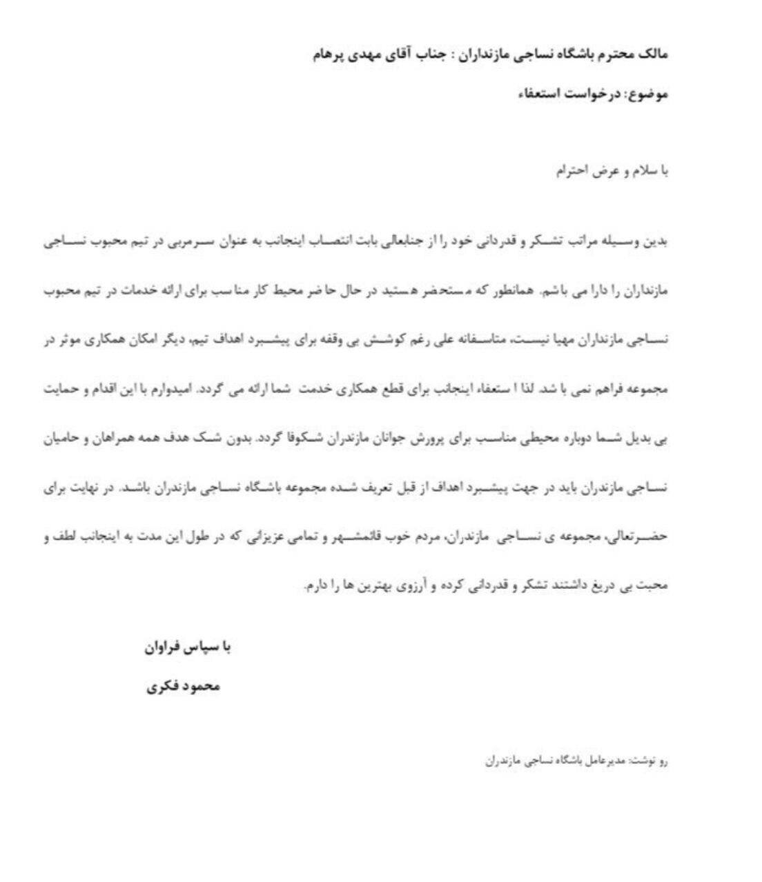 محمود فکری سرمربی تیم فوتبال نساجی پس از انتظار ۲ هفتهای و عملی نشدن خواستههایش نامه استعفایش را تقدیم مهدی پرهام مالک باشگاه نساجی کرد.