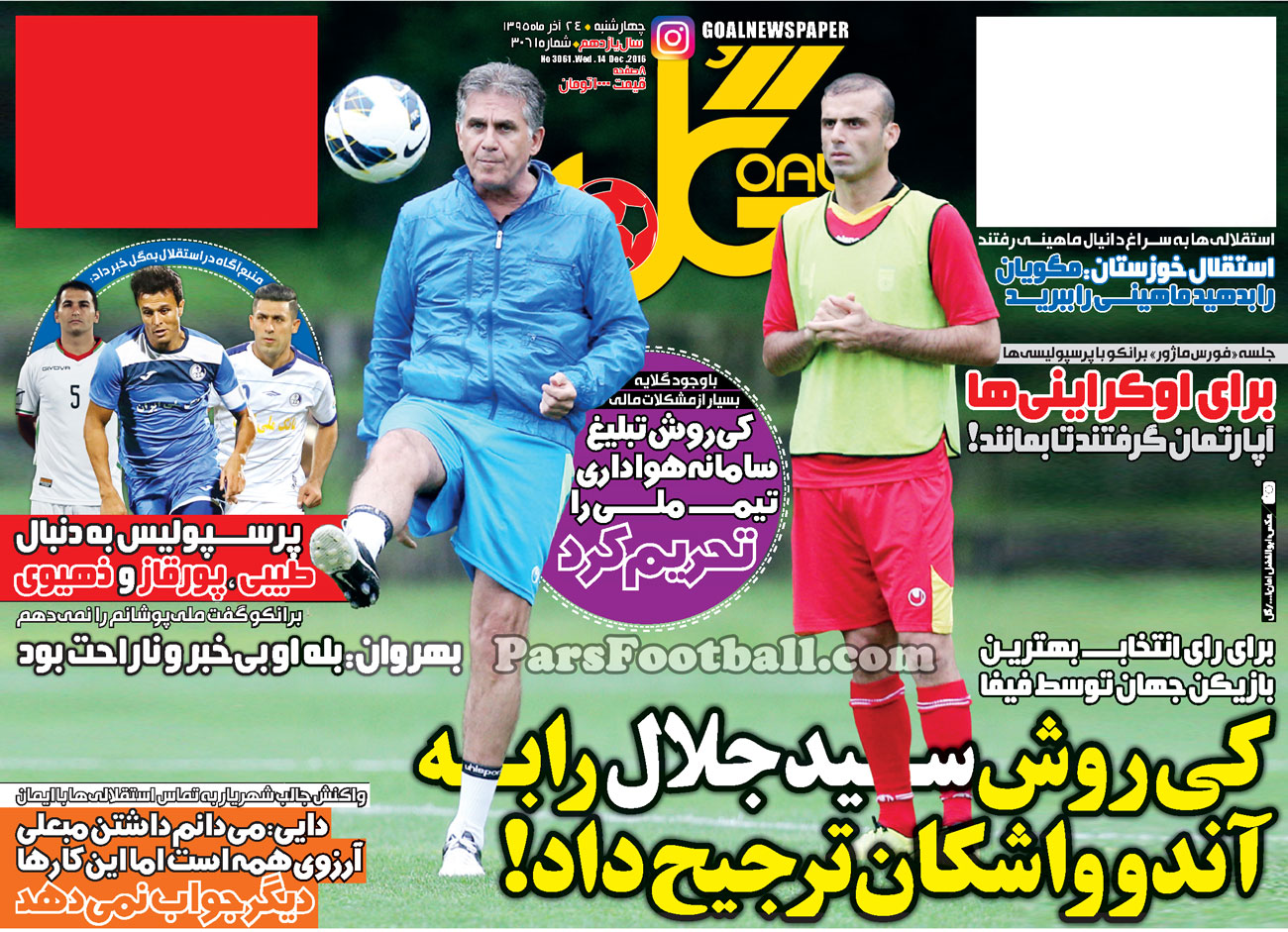 روزنامه گل ، چهارشنبه ۲۴ آذر ؛ کی روش تحریم کرد !