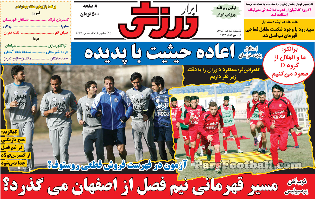عناوین روزنامه ابرار ورزشی در روز پنجشنبه ۲۵ آذر به شرح زیر است :