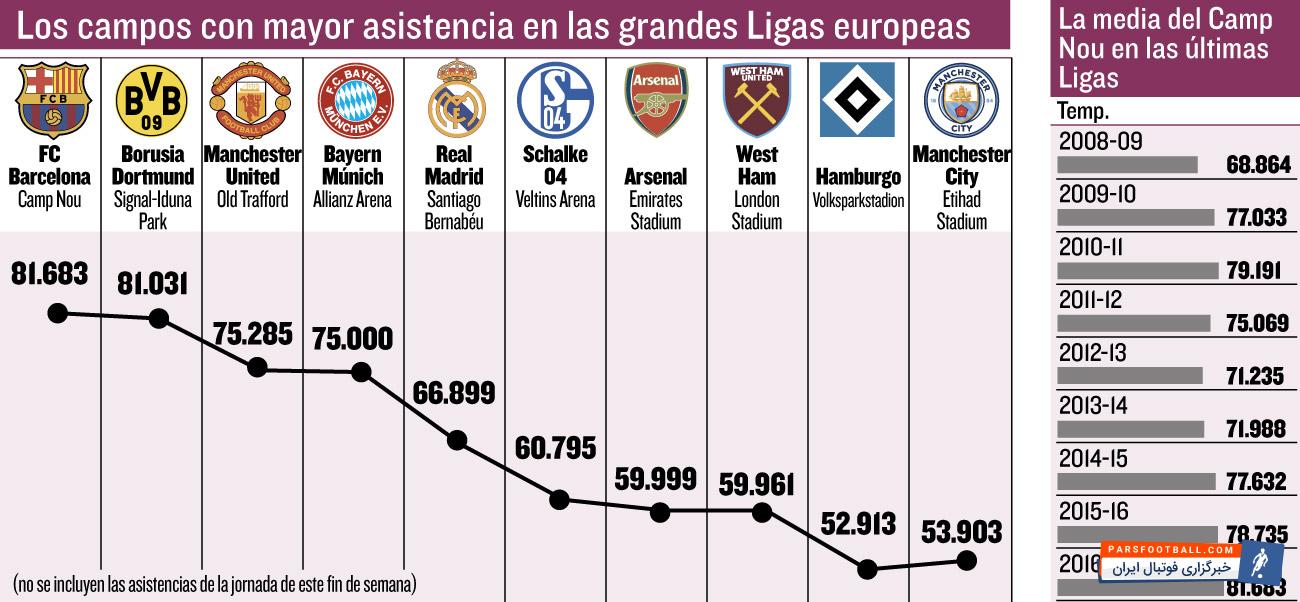 بارسلونا رکوردی که هر فصل به دورتموند می رسید را فعلا در اختیار خود دارد. تا بدینجای فصل، متوسط ۸۱۶۸۳ تماشاگر از بازی های خانگی بارسلونا دیدن کرده اند و این آمار برای بروسیا دورتموند، ۸۱۰۳۱ تماشاگر در زیگنال ایدونا پارک بوده است.