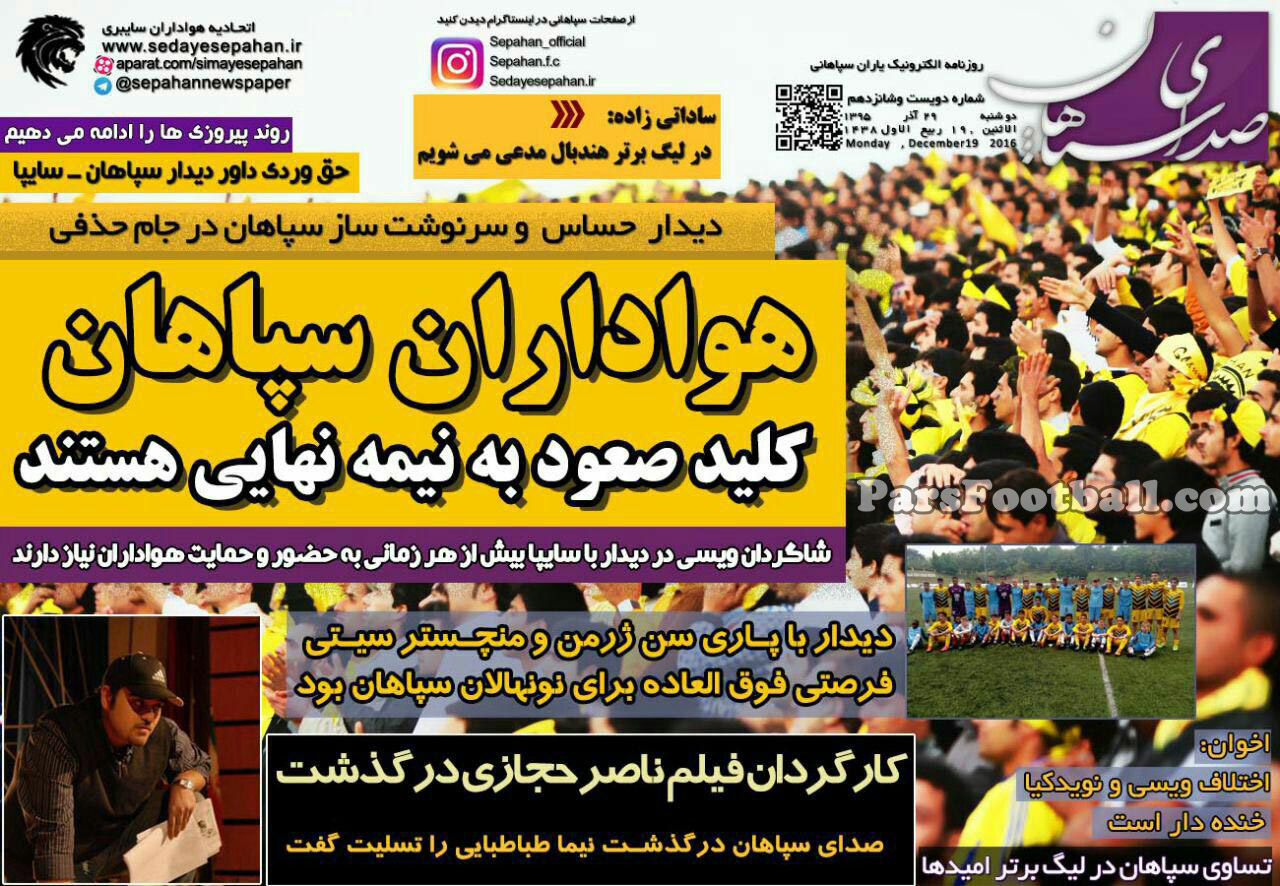 روزنامه صدای سپاهان ، دوشنبه ۲۹ آذر ؛ هواداران سپاهان کلید صعود به نیمه نهایی هستند