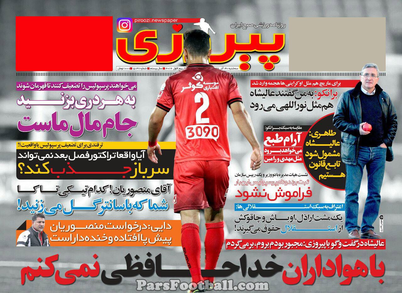 روزنامه پیروزی ، سهشنبه ۳۰ آذر ؛ پاسخ برانکو به جدایی طلبان