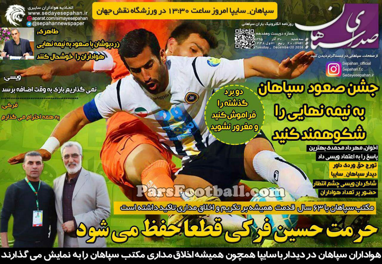 روزنامه صدای سپاهان ، سهشنبه ۳۰ آذر ؛ واکنش هواداران سپاهان به حضور فرکی در اصفهان