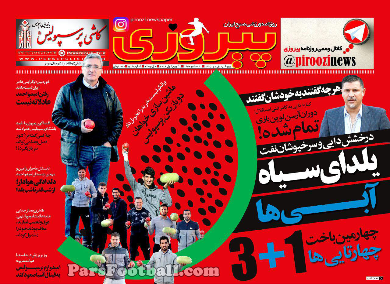 روزنامه پیروزی ، چهارشنبه ۱ دی ؛ چهارمین باخت چهارتاییها