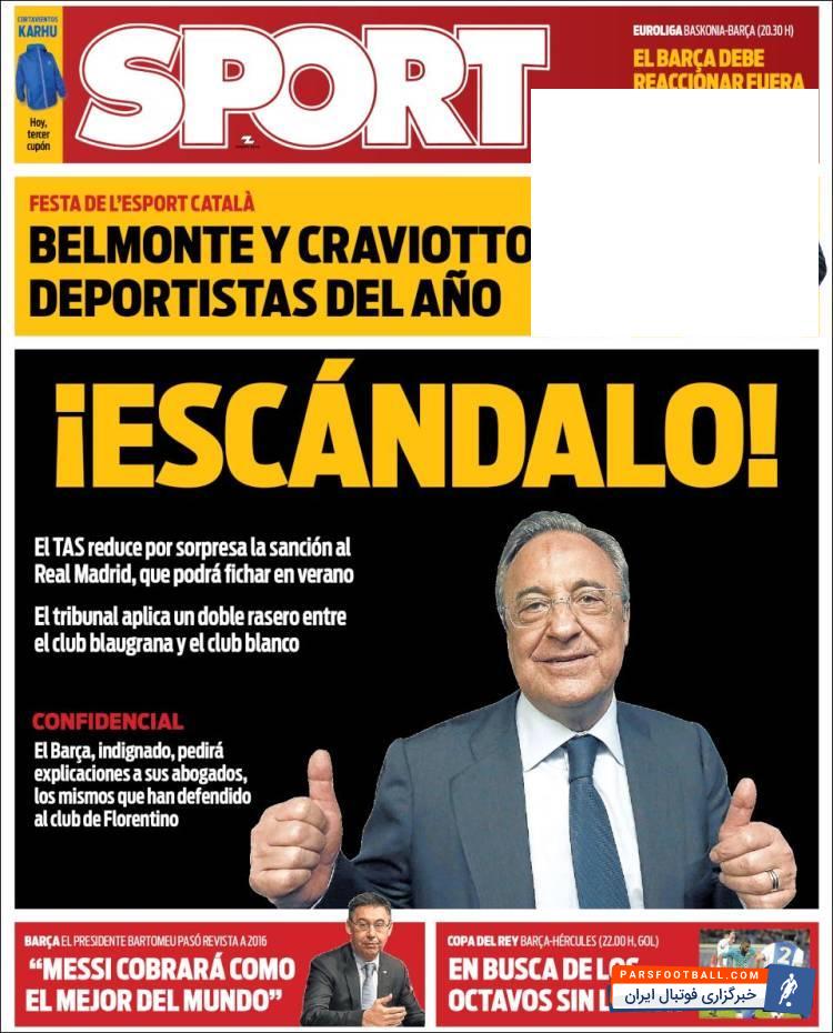 هر دو نشریه ورزشی اول چاپ بارسلونا یعنی موندودپورتیوو و دیاریو اسپورت، در شماره امروز خود واکنش تندی به کاهش محرومیت رئال از خرید بازیکن در دادگاه CAS نشان دادند.
