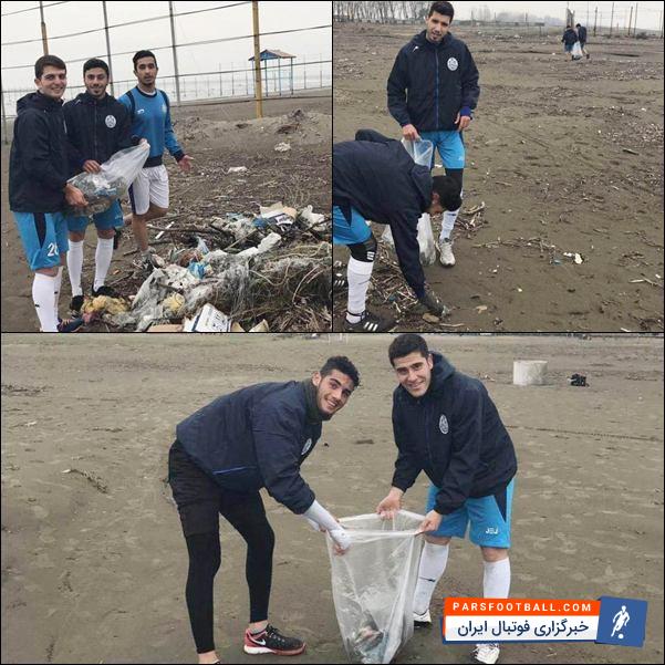 بازیکنان تیم فوتبال ملوان بندر انزلی که بعضی از جلسات تمرینی خود را در ساحل انجام می دهند، امروز پس از انجام تمرینات هوازی در ساحل، زبالههای محیط تمرین خود را جمعآوری کردند.
