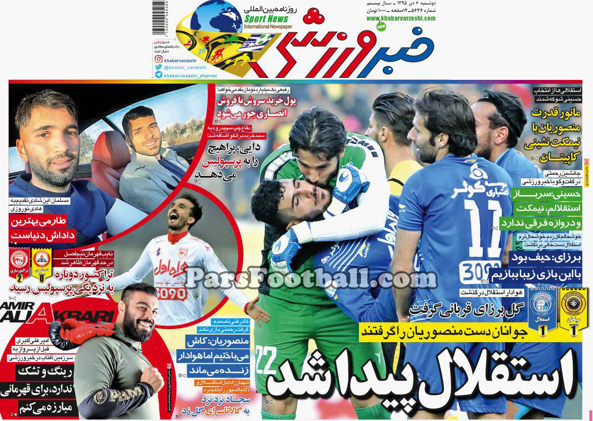 عناوین روزنامه خبرورزشی در روز دوشنبه ۶ دی به شرح زیر است :