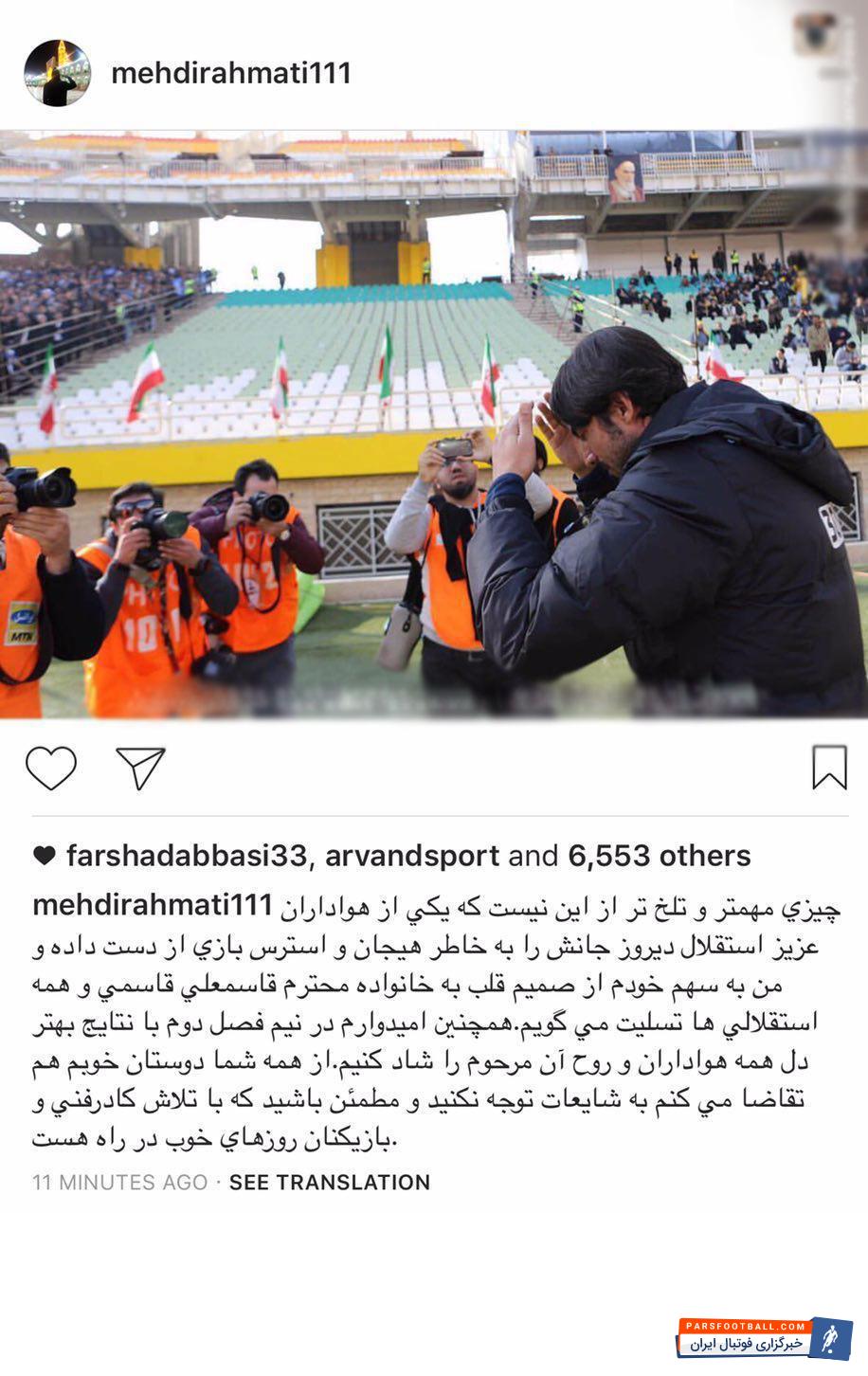 پست اینستاگرامی مهدی رحمتی برای تسلیت به خانواده هوادار استقلال
