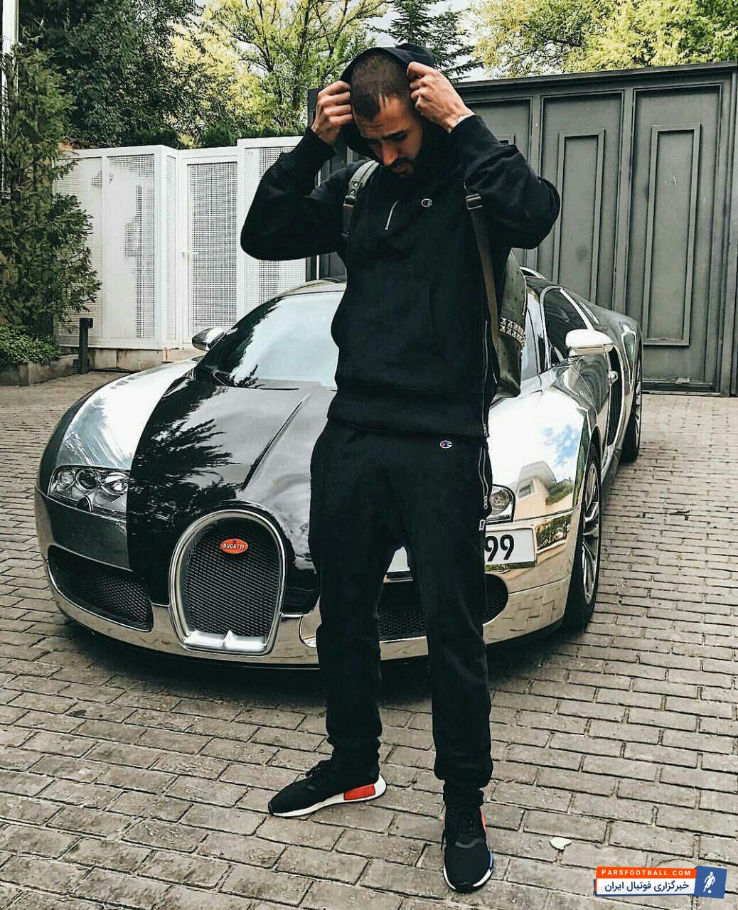 عکسی از " کریم بنزما " ستاره تیم فوتبال رئال مادرید با لباس شخصی در کنار خودرو خود