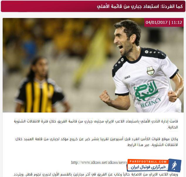 اما امروز باشگاه الاهلی به طور رسمی این مسئله را عنوان کرد تا مجتبی جباری که دو بازی اخیر تیمش را به دلیل مصدومیت از دست داد به زودی راهی تیم دیگری شود. به گفته پزشکان باشگاه الاهلی دوحه ، جباری به یک ماه زمان برای بهبودی نیاز دارد.