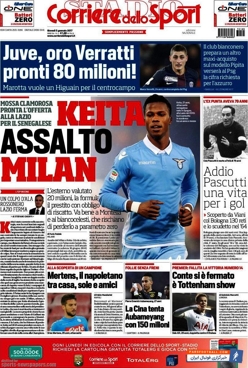 روزنامه کوریره دلو اسپورت ، پنجشنبه ۵ ژانویه ؛ کیتا، حمله میلان