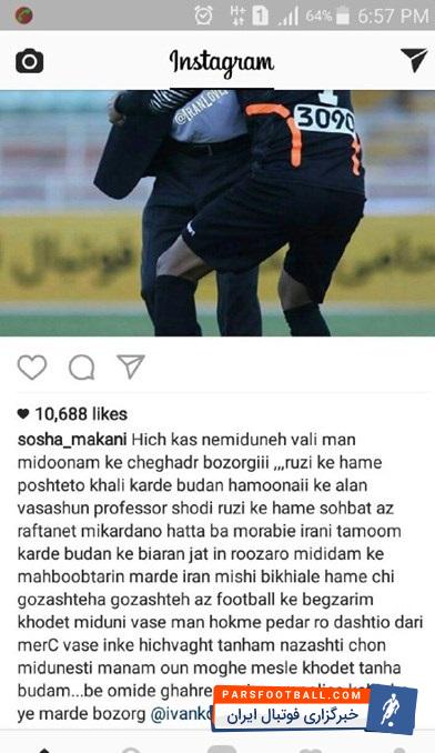 سوشا مکانی در پستی اینستاگرامی از برانکو ایوانکوویچ قاطعانه حمایت کرد و اظهار داشت: هیچکس نمی داند اما من می دانم که چقدر بزرگ هستید، روزی که همه پشت شما را خالی کردند بودند همان هایی که الان برایشان پروفسور شدید. روزی که همه صحبت از رفتنت می کردند حتی با مربی های ایرانی تمام کرده بودند که به جای تو بیایند این روزها را می دیدم که محبوب ترین مرد ایران می شوی. بی خیال همه چیز گذشته ها گذشته از فوتبال که بگذریم خودت می دانی برای من حکم پدر را داشتی و داری. مرسی برای اینکه هیچوقت تنهام نگذاشتی چون می دانستی من هم آن موقع مثل خودت تنها بودم. به امید قهرمانی پرسپولیس کبیر با یک مرد بزرگ.