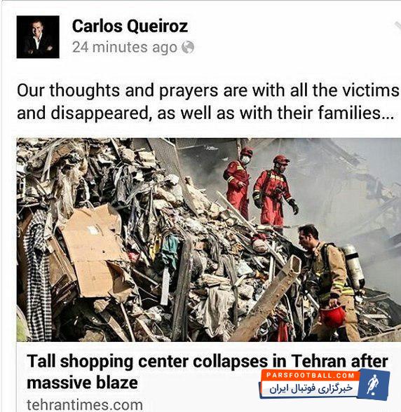کارلوس کی روش با انتشار پیامی حادثه امروز ساختمان پلاسکو را تسلیت گفت.