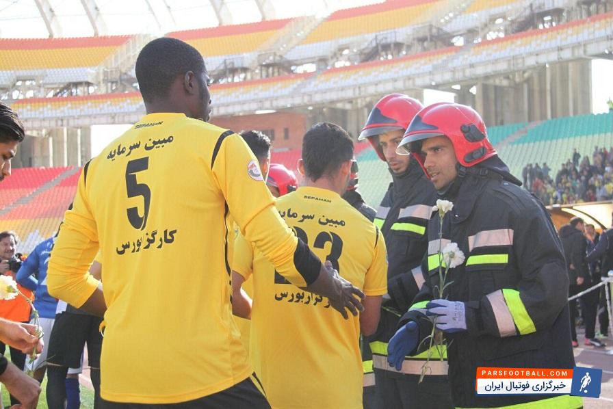 اهدای گل به آتشنشانها در ورزشگاه نقش جهان