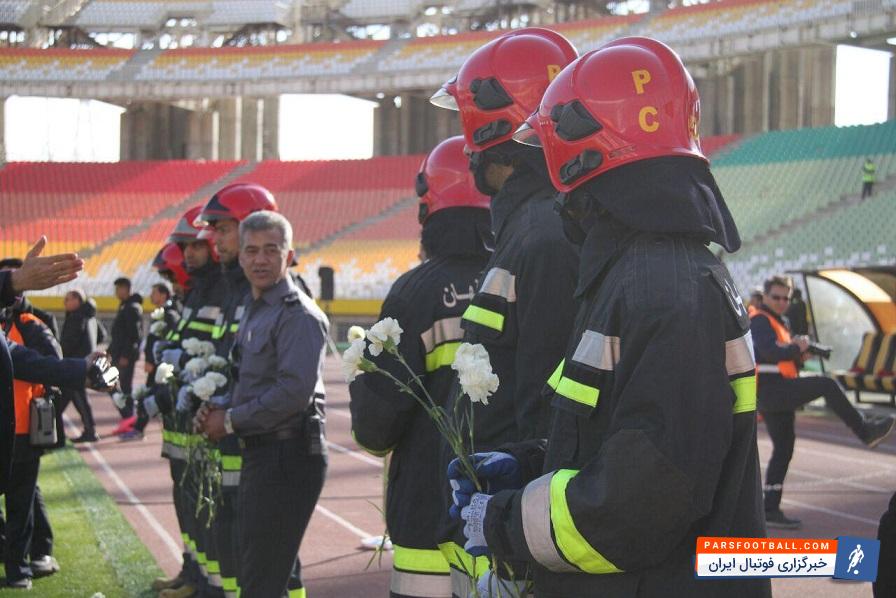 اهدای گل به آتشنشانها در ورزشگاه نقش جهان