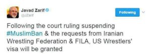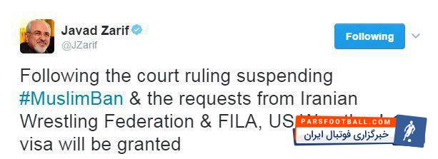 وزیر خارجه کشورمان گفت که به دنبال حکم قاضی فدرال و تعلیق ممنوعیت ورود مسلمانان، و به درخواست فدراسیون کشتی و فدراسیون جهانی به تیم ملی کشتی آمریکا ویزا اعطا خواهد شد.