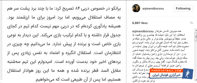 همه میدونین که من طرفدار استقلال هستم ، اما این دلیل نمیشه که چشمم و رو واقعیت ها ببندم، حقیقتاً پرسپولیس چشم نواز و عالى بازى میکنه و بنظرم حق اینه که امسال قهرمان ایران بشه، امیدوارم تیم محبوبم استقلال مقابل تیم السد نتیجه بگیره و ایران چهار نماینده در آسیا داشته باشه. ممنون آقاى برانکو بابت اینهمه شعور.