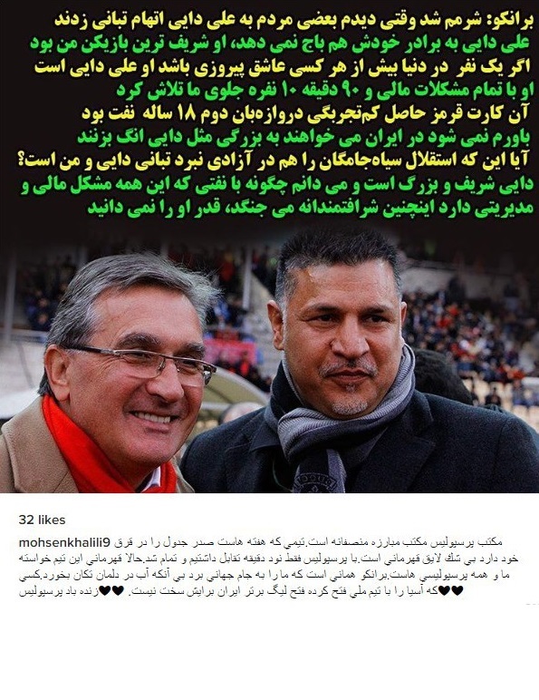 محسن خلیلی سرپرست تیم نفت در خصوص صحبت های اخیر برانکو درمورد علی دایی و تیم نفت در صفحه شخصی اینستاگرامش واکنش قابل توجهی نشان داد.