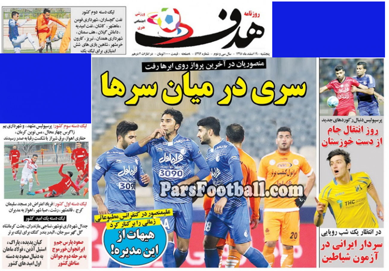عناوین روزنامه هدف در روز پنجشنبه ۱۹ اسفند به شرح زیر است :