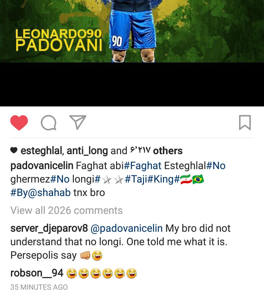 یکی از کامنتهای عجیب پست پادوانی هم، توسط سرور جپاروف نوشته شده است. هافبک ازبکستانی سپاهان که اخیرا اعلام کرده در پایان فصل به استقلال بازخواهد گشت، در جواب این پست پادو نوشته: برادر من نمیداند معنی … چیست. به من معنی این کلمه را بگو. جپاروف در ادامه این کامنت از شکلک خنده هم استفاده کرده و اینطور به نظر میرسد که او با این که معنی این کلمه را میداند این کامنت شیطنتآمیز را نوشته است. باید منتظر ماند و دید که پادوانی از پست را اصلاح میکند یا نه.