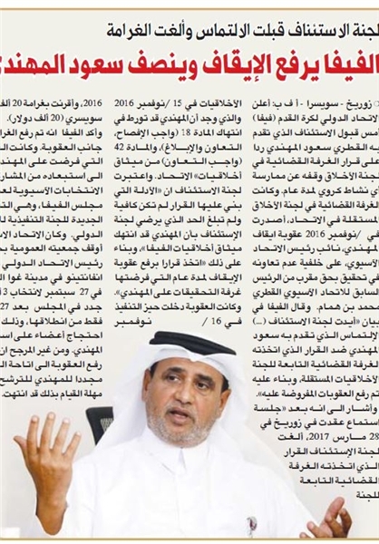 کمیته استیناف فدراسیون جهانی فوتبال (فیفا) و بخشیدن محرومیت سعود المهندی نایب رئیس فدراسیون فوتبال قطر