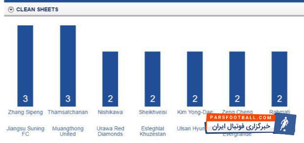 سید مهدی رحمتی و وحید شیخ ویسی هر دو با ۲ کلین شیت به همراه سه دروازه بان از شرق آسیا در رده سوم از نظر تعداد کلین شیت حضور دارند.