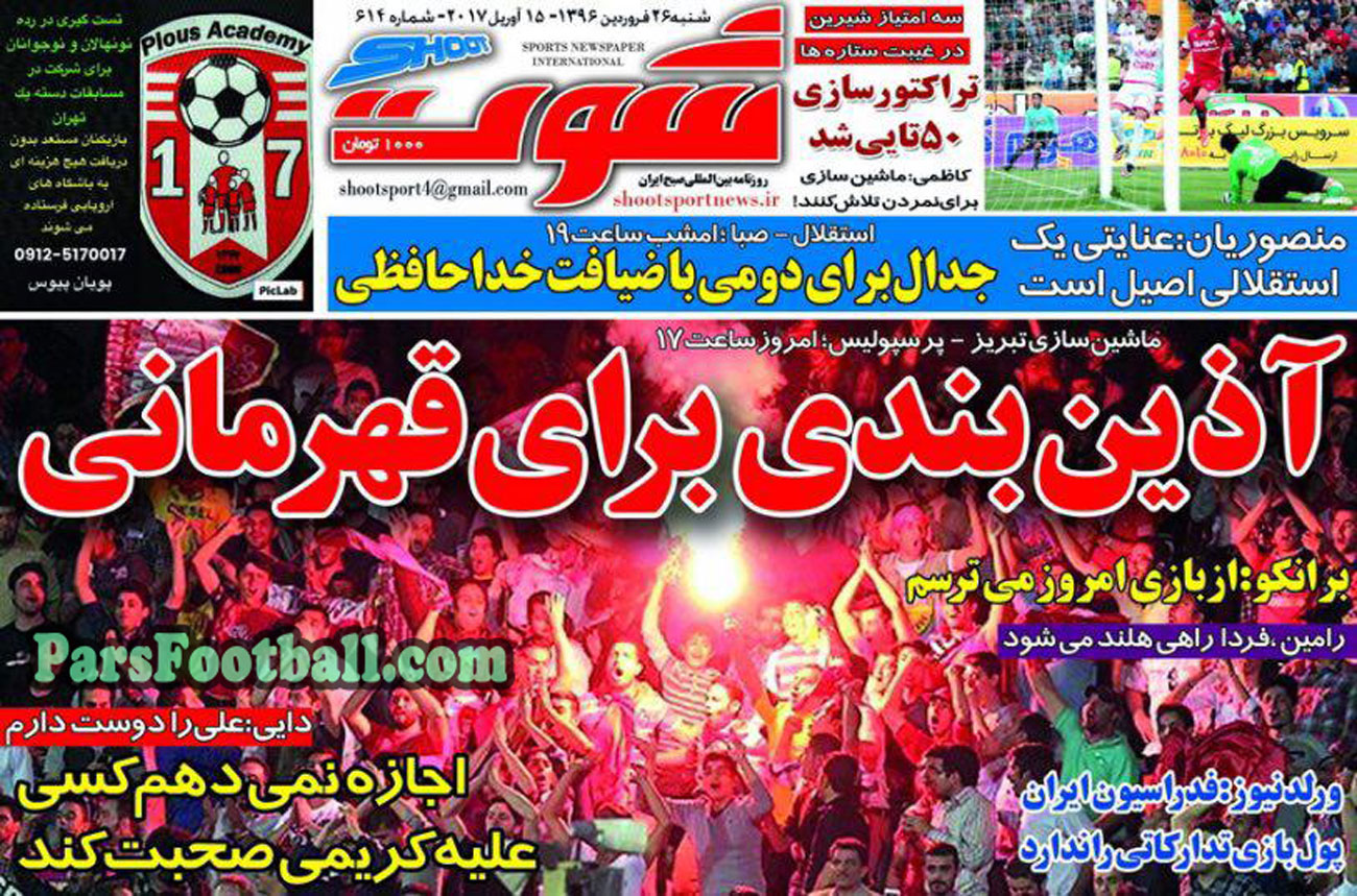 عناوین روزنامه شوت در روز شنبه ۲۶ فروردین به شرح زیر است :