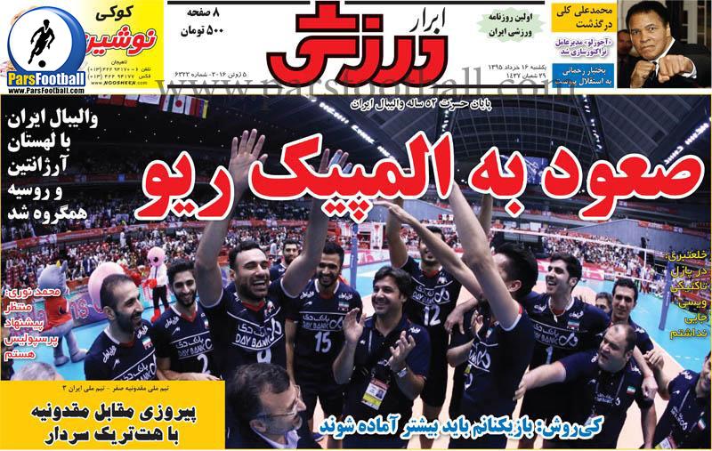 روزنامه ابرار ورزشی ۱۶ خرداد | صعود به المپیک ریو | کی روش : بازیکنانم باید بیشتر آماده شوند