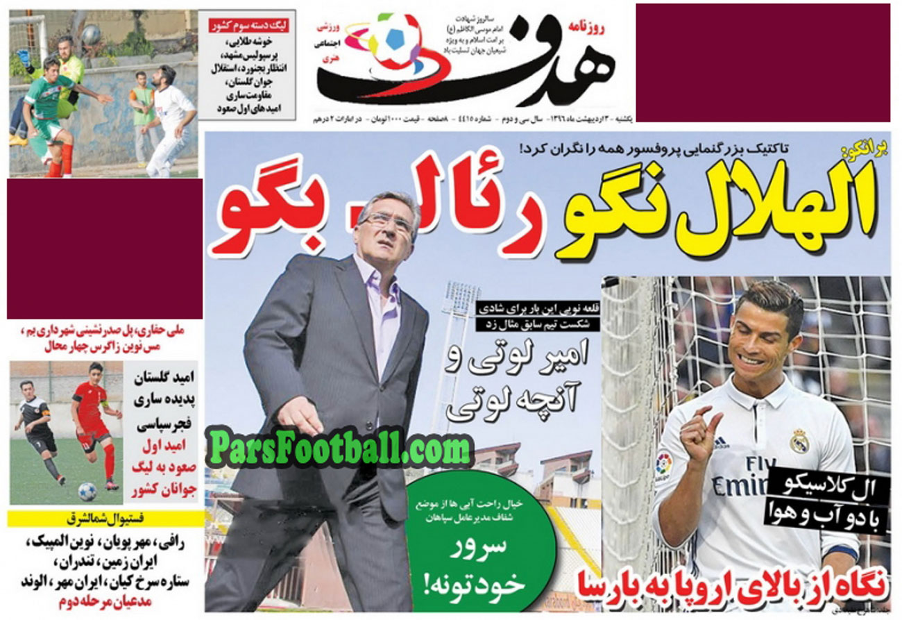 روزنامه هدف ، یکشنبه ۳ اردیبهشت ؛ الهلال نگو ، رئال بگو !