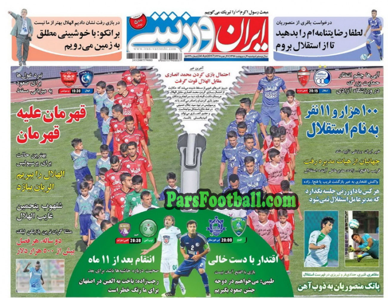 روزنامه ایران ورزشی ، دوشنبه ۴ اردیبهشت ؛ ۱۰۰ هزار و ۱۱ نفر به نام استقلال