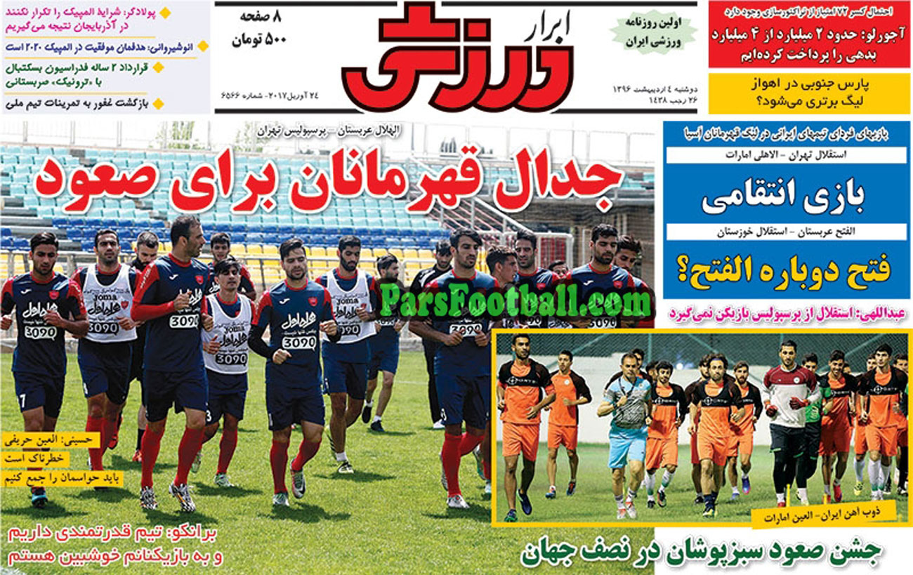 روزنامه ابرار ورزشی ، دوشنبه ۴ اردیبهشت ؛ جدال قهرمانان برای صعود