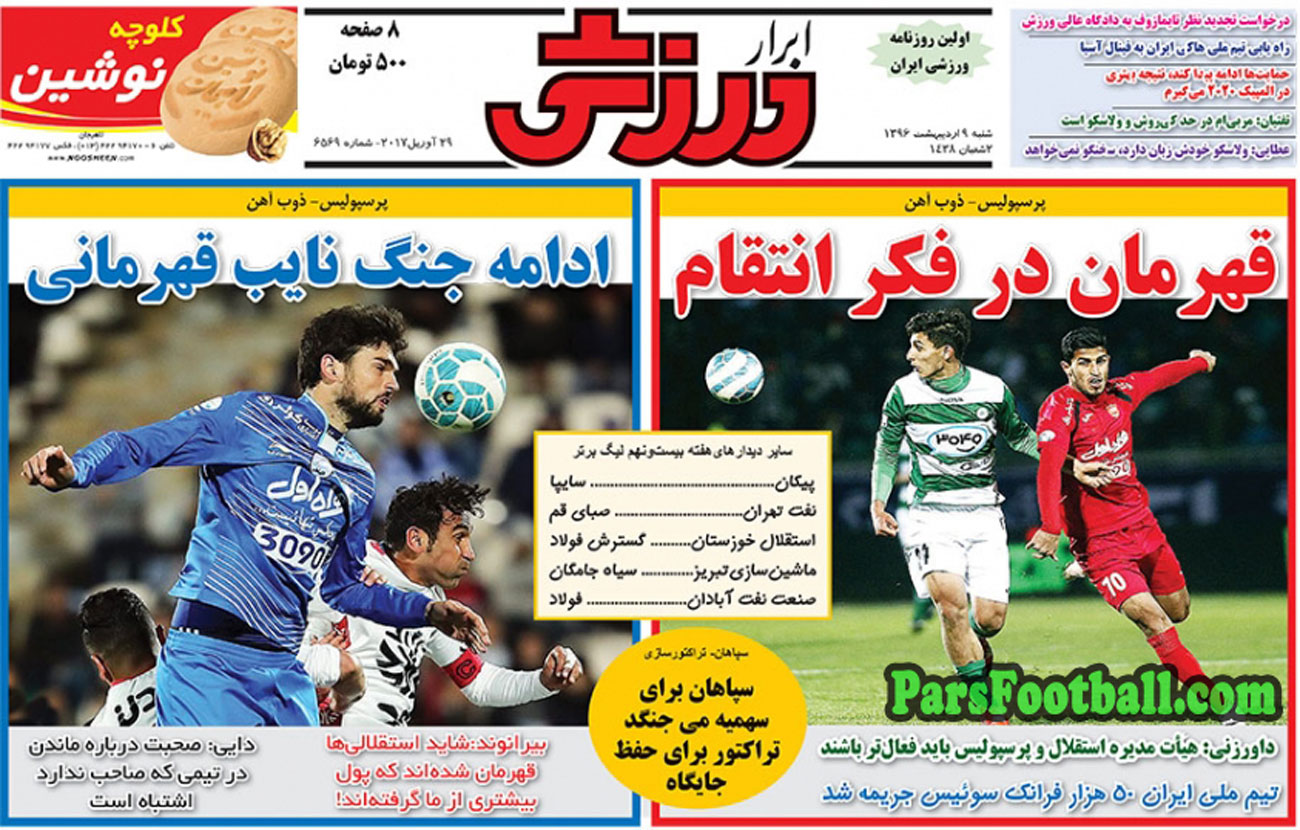 روزنامه ابرار ورزشی ، شنبه ۹ اردیبهشت ؛ قهرمان در فکر انتقام !