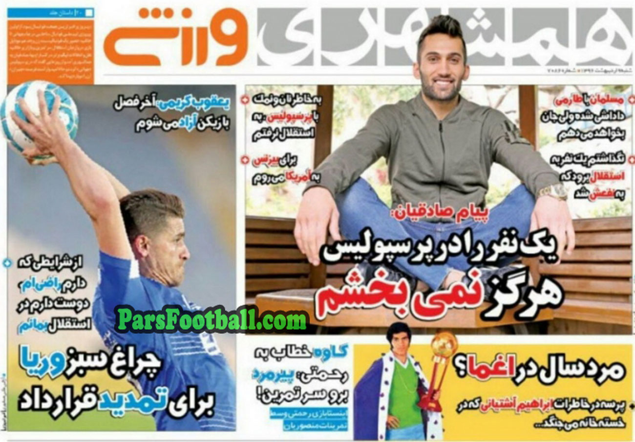 روزنامه همشهری ورزشی ، شنبه ۹ اردیبهشت ؛ یک نفر را در پرسپولیس هرگز نمی بخشم