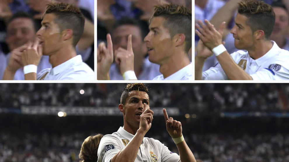 رونالدو و ژست او پس از زدن گل سوم به اتلتیکومادرید در نیمه نهایی لیگ قهرمانان اروپا و پیروزی رئال مادرید