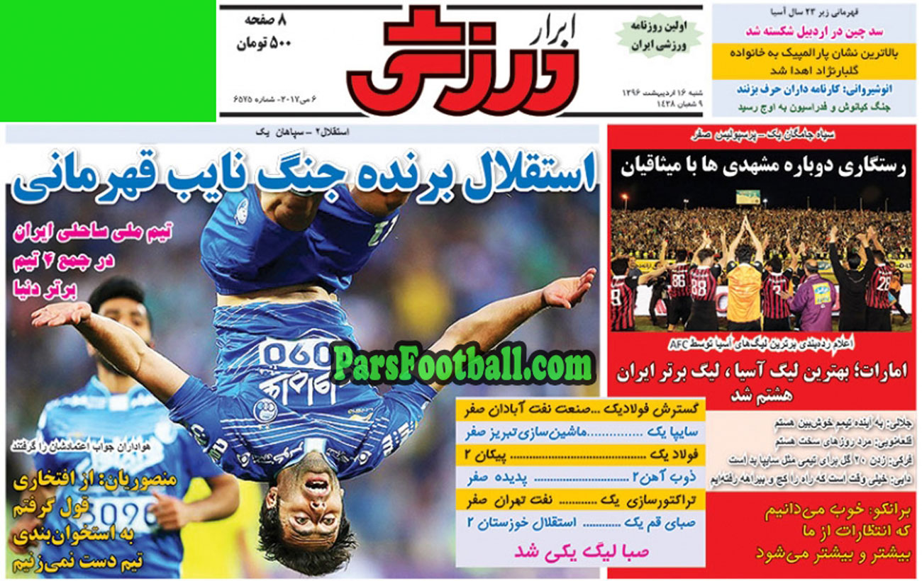 روزنامه ابرار ورزشی ، شنبه ۱۶ اردیبهشت ؛ استقلال برنده جنگ نایب قهرمانی