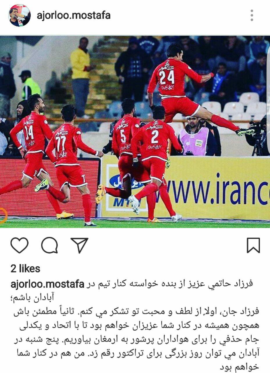مدیرعامل تراکتورسازی در واکنش به این درخواست عنوان کرد: «فرزاد حاتمی عزیز از بنده خواسته کنار تیم در آبادان باشم؛ فرزاد جان اولا از لطف و محبت تو تشکر میکنم. ثانیا مطمئن باش همچون همیشه در کنار شما عزیزان خواهم بود تا با اتحاد و یکدلی جام حذفی را برای هواداران پرشور به ارمغان بیاوریم. پنجشنبه در آبادان میتوان روز بزرگی برای تراکتور رقم زد. من هم در کنار شما خواهم بود.»
