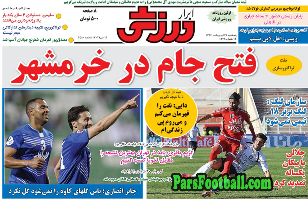 عناوین روزنامه ابرار ورزشی در روز پنجشنبه ۲۱ اردیبهشت به شرح زیر است :