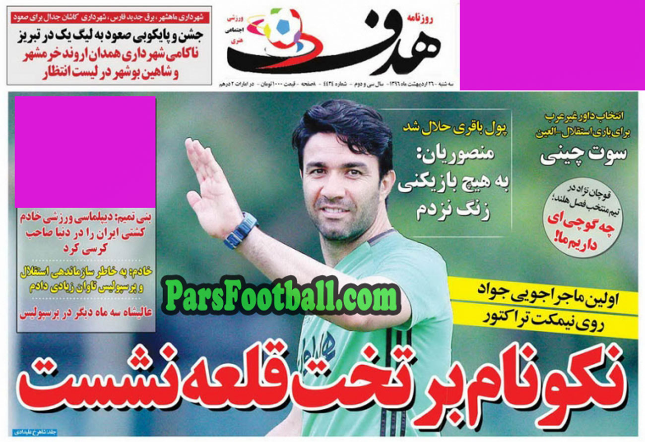 روزنامه هدف ، سهشنبه ۲۶ اردیبهشت ؛ نکونام بر تخت قلعه نشست