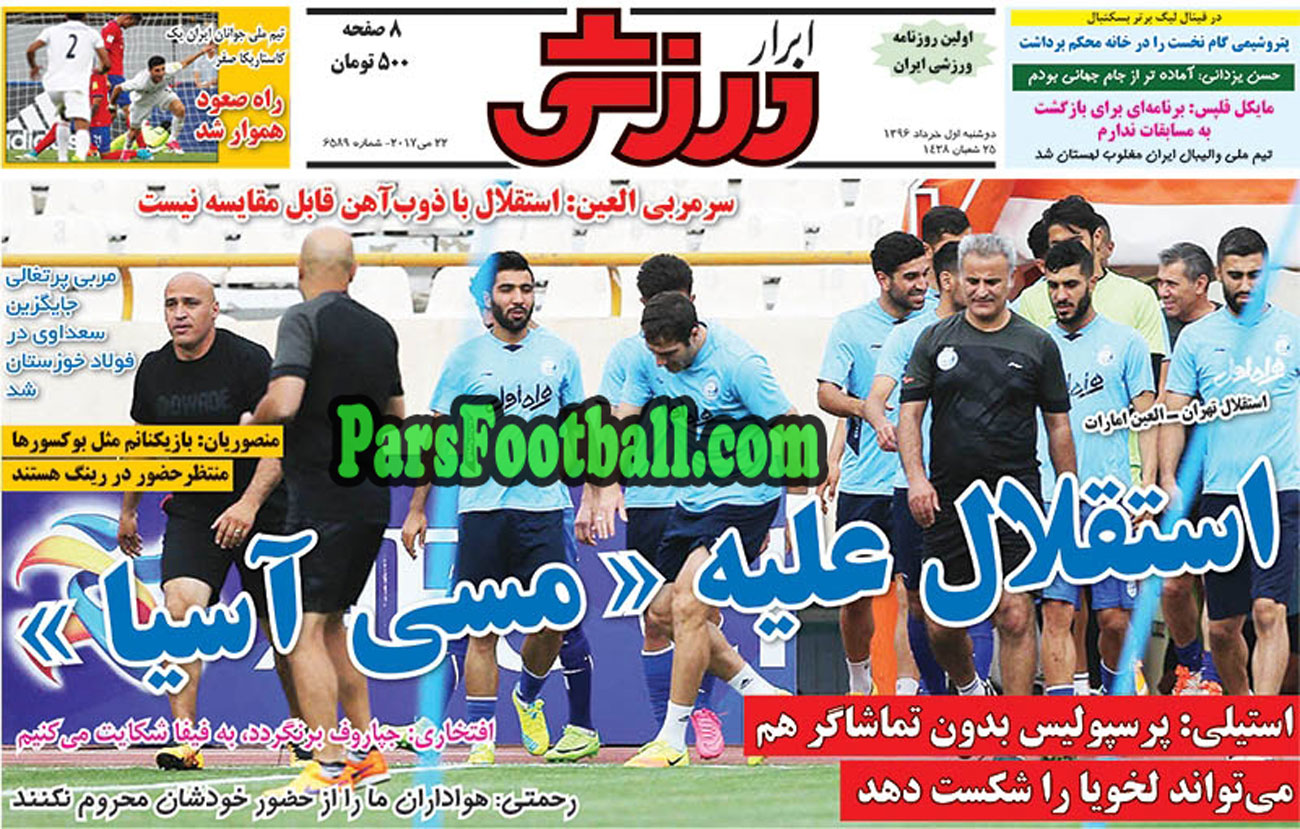 روزنامه ابرار ورزشی ، دوشنبه ۱ خرداد ؛ استقلال علیه مسی آسیا