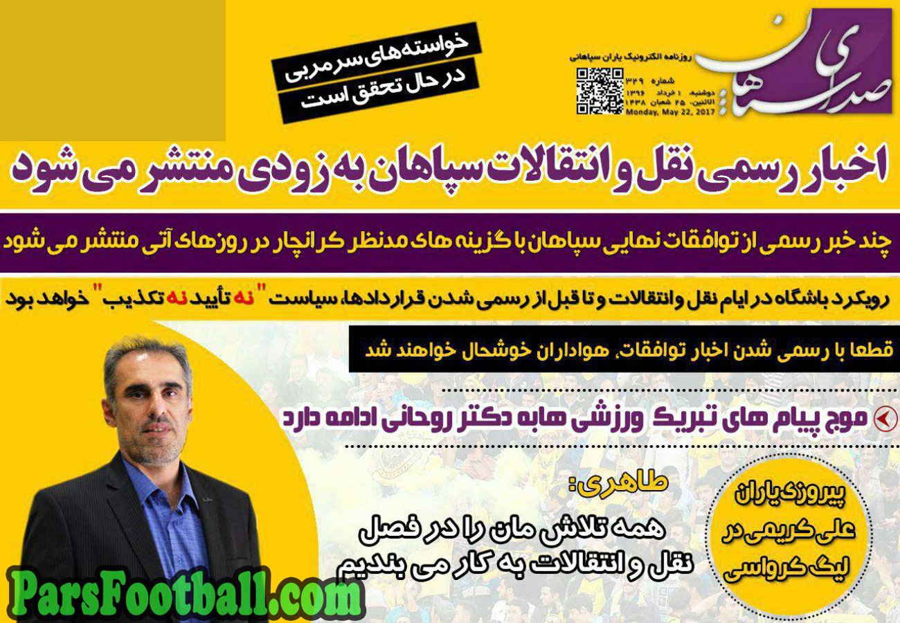 روزنامه صدای سپاهان ، دوشنبه ۱ خرداد ؛ هواداران خوشحال خواهند شد