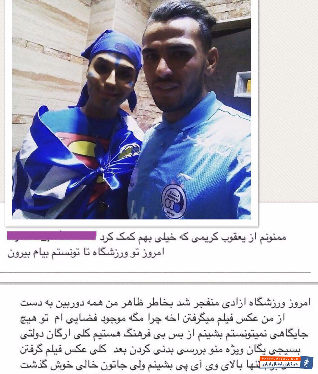 ممنونم از یعقوب کریمی که خیلی بهم کمک کرد امروز تو ورزشگاه تا تونستم بیام بیرون.