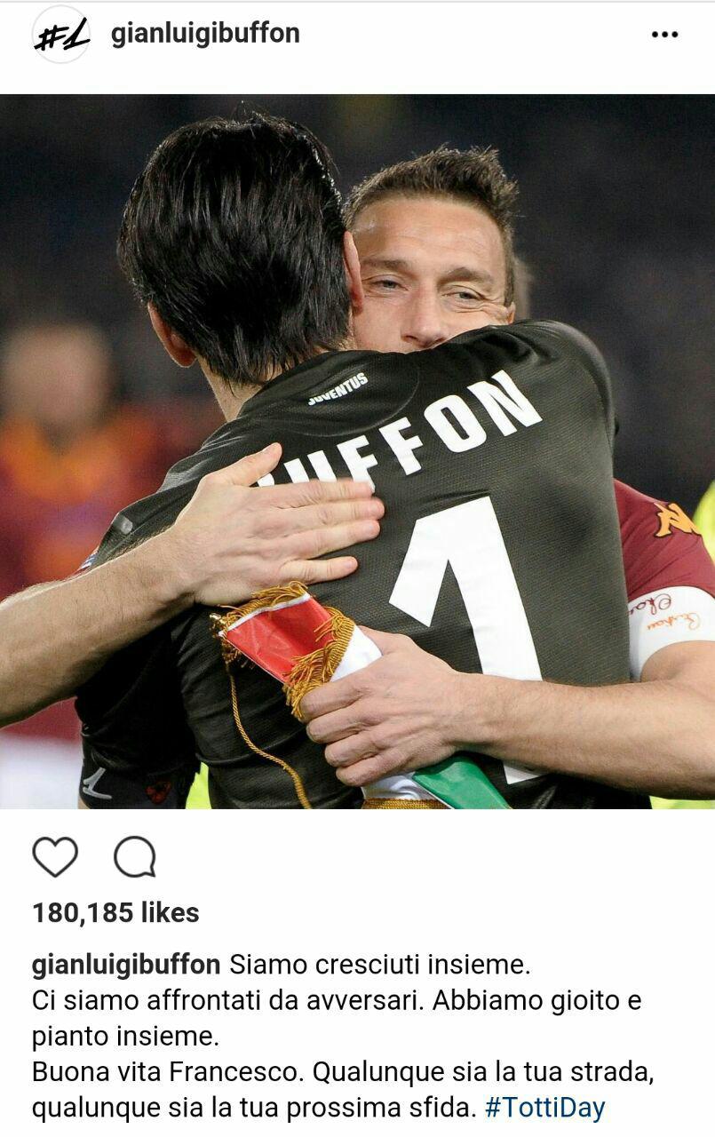 بوفون که تقریبا همزمان با توتی در فوتبال ایتالیا چهره شد و سال ها در تیم ملی با او همبازی بود، با انتشار این عکس، در اینستاگرامش نوشت: با هم رشد کردیم، با هم تجربه کردیم، با هم رقابت کردیم و با هم گریه کردیم. برایت آرزوی موفقیت میکنم.