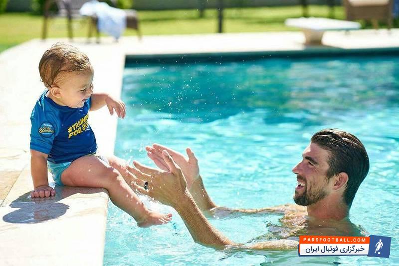 مایکل فلپس ، ورزشکار پرافتخار و بهترین شناگر جهان و پسرش بومر در مرحله آشنایی با آب.