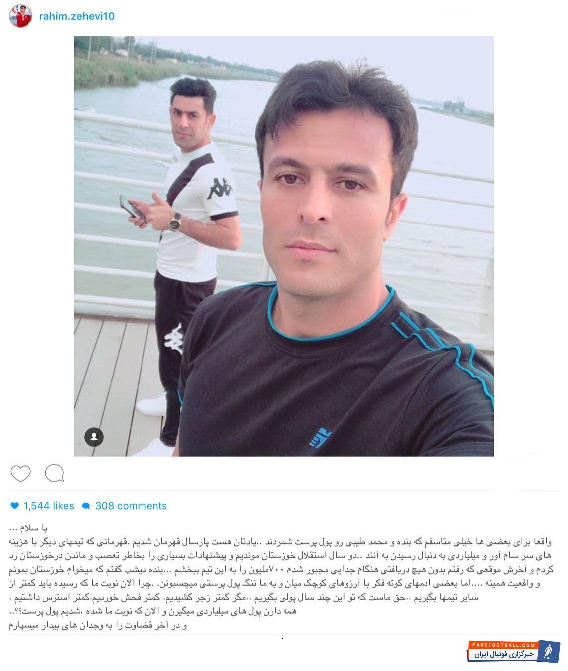 رحیم زهیوی مهاجم و گلزن اسبق استقلال خوزستان با انتشار متنی در برگه اینستاگرامش به انتقادات اخیر واکنش نشان داد.