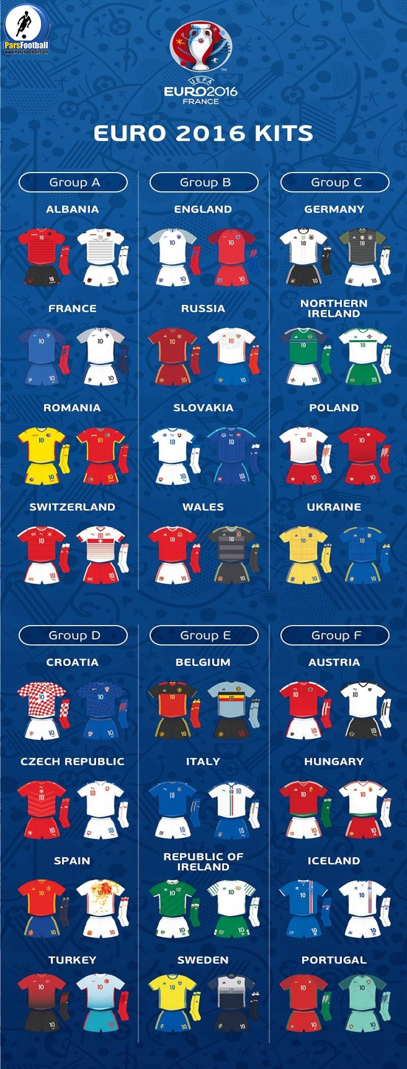 در آستانه آغاز رقابت های یورو 2016، کیت اول و دوم تیم های حاضر در این مسابقات، توسط سایت یوفا منتشر شد.