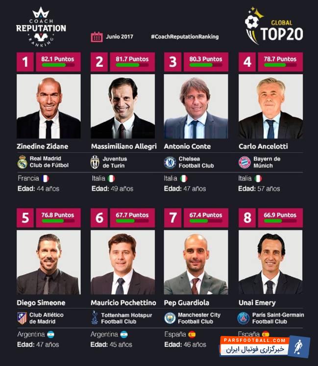 امروز رده بندی بهترین سرمربیان دنیا از سوی “Coach Reputation Ranking Observatory” منتشر شد که بر این اساس زیدان بالاتر از آلگری، کونته و آنچلوتی در صدر قرار گرفت.فاکتورهایی چون عملکرد و افتخارات مربی در طول یک فصل، فعالیت در شبکه های اجتماعی، نوع برخورد با رسانه ها و تاثیر او بر مطبوعات، ارتباط و محبوبیت او در جامعه مربیان و…. در رده بندی بهترین سرمربی لحاظ شده است.