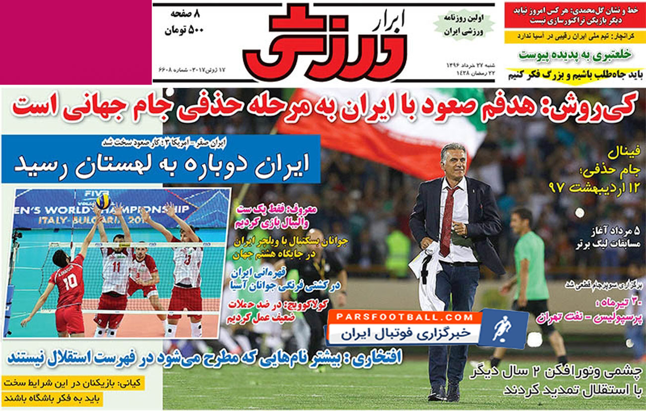 عناوین روزنامه ابرار ورزشی در روز شنبه ۲۷ خرداد به شرح زیر است :