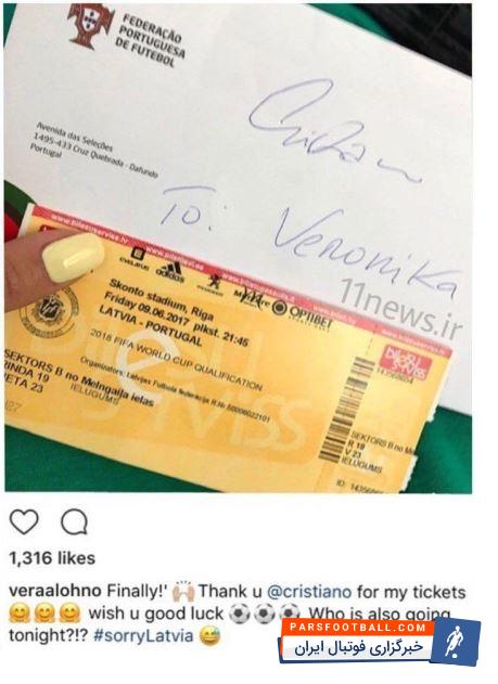 داستان از این قرار است که هفته گذشته وِرا آلوهنو مدل سرشناس اهل لتونی در صفحه اینستاگرامش عکسی از یک دعوتنامه و بلیت بازی تیمهای لتونی و پرتغال در ریگا (پایتخت لتونی) منتشر میکند که با تشکر ویژهای از کریس رونالدو همراه است. این دعوتنامه در پاکت نامه رسمی فدارسیون فوتبال پرتغال برای او ارسال شده و همانطور که در تصویر مشخص است کریس برای ورا آن را امضا و ارسال کرده است.